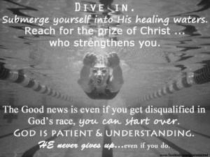 In essence, I am just a beginner swimmer. I have not totally learned to submerge myself into His healing waters. I must learn to dive off the starting blocks to get a great push forward. It will help me to swim as fast as I can to reach for the prize–Christ who strengthens me.
